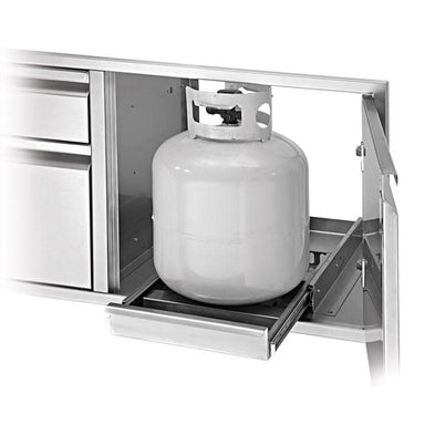 Easily mounts inside door/drawer combo Allows for easy access to an LP tank or trash container Constructed of heavy gauge stainless steel